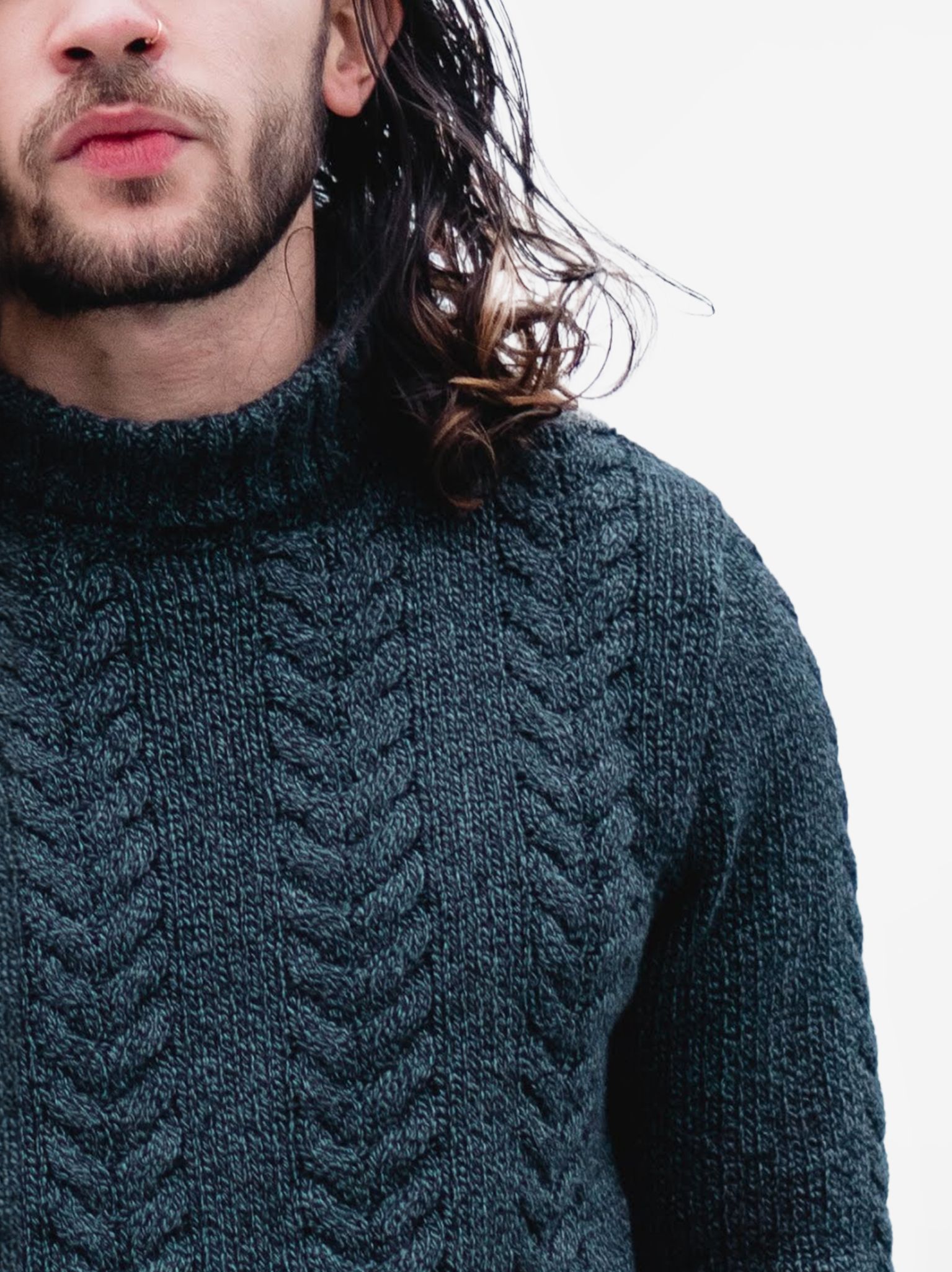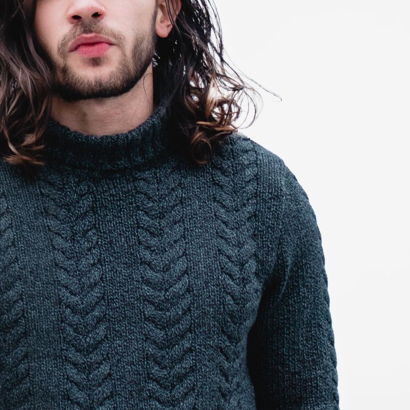 - Rounded neck with long sleeves and cable-knit finish